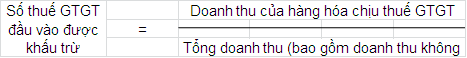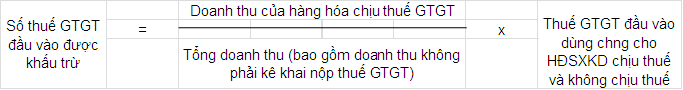 – Số thuế GTGT đầu vào được khấu trừ sẽ được tính theo tỷ lệ (%) giữa doanh thu chịu thuế GTGT,doanh thu không phải kê khai, tính nộp thuế GTGT so với tổng doanh thucủa hàng hóa, dịch vụ bán ra (bao gồm cả doanh thu không phải kê khai, tính nộp thuế không hạch toán riêng được).
