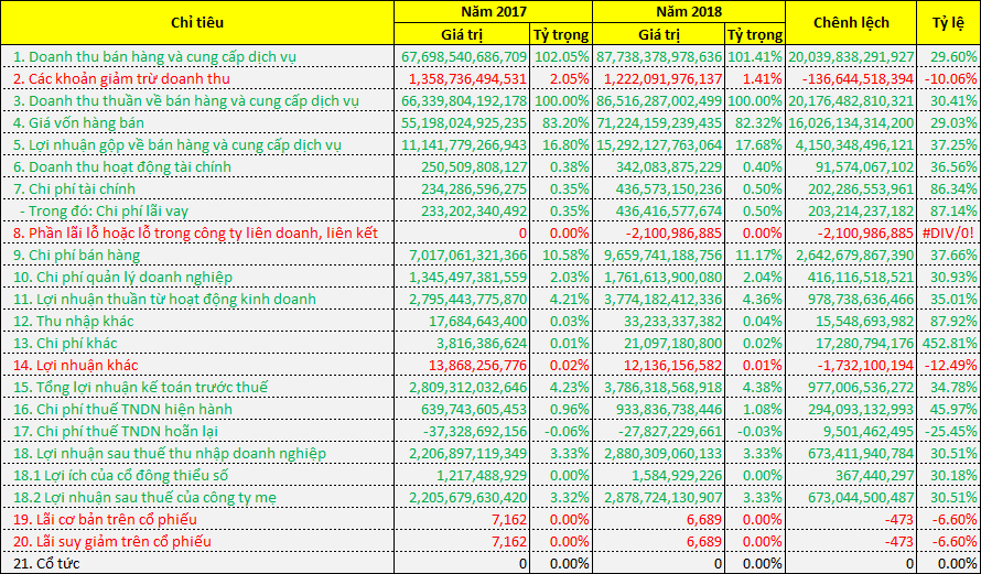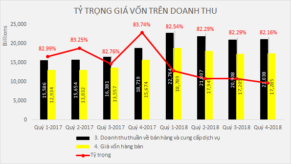 Nhìn qua 8 quý, dù cả doanh thu lẫn giá vốn hàng bán đều tăng nhưng tỷ trọng giá vốn trên doanh thu đang có xu hướng giảm, điều này làm biên lợi nhuận gộp tăng từ 16.8% năm 2017 lên 17.68% năm 2018.