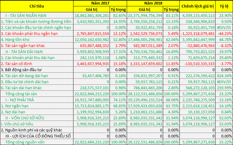 Vào thời điểm cuối năm 2018, tổng tài sản của công ty đạt 28.122 tỷ đồng, tăng 23.22% so với cùng kỳ năm ngoái, đáng kể đến là hàng tồn kho tăng 44.78% tương đương 5.395 tỷ đồng và các khoản phải thu dài hạn tăng 29.6% tương đương 71 tỷ đồng. Các khoản phải thu ngắn hạn giảm 44.23% tương đương 1.223 tỷ đồng tạo đòng tiền hoạt động cho công ty. Ngoài ra nợ ngắn hạn cũng tăng 14.1%, đạt 17.929 tỷ đồng và vốn chủ sở hữu đạt 8.983 tỷ đồng, tăng 52% so với năm 2017.