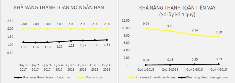 Khả năng thanh toán nợ ngắn hạn ngày càng tăng dần qua 8 quý tuy nhiên vẫn chỉ nằm ở mức trung bình, đạt 1.31 ở quý 4-2018. Tỷ lệ nợ trên tài sản dao động trung bình ở mức 69.25% - một mức khá cao, khả năng thanh toán lãi vay (số lũy kế) có xu hướng giảm nhưng vẫn ở mức tốt. Khả năng chi trả gốc vay tăng dù vẫn ở mức thấp.