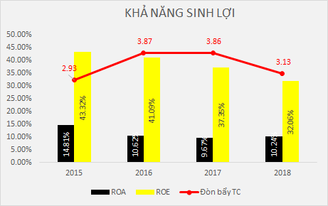 Khả năng sinh lợi của công ty giảm qua 4 năm nhưng vẫn ở một mức cao, hấp dẫn nhà đầu tư. Đòn bẩy tài chính cũng giảm dần kể từ năm 2016. Chỉ số P/E của công ty là 9.8 là một mức khá thấp và EPS đạt 8.582 đồng. Giá cổ phiếu của công ty hiện đang giảm về vùng 84.000 đồng, cao hơn 4 lần so với giá trị sổ sách là 20.260 đồng.
