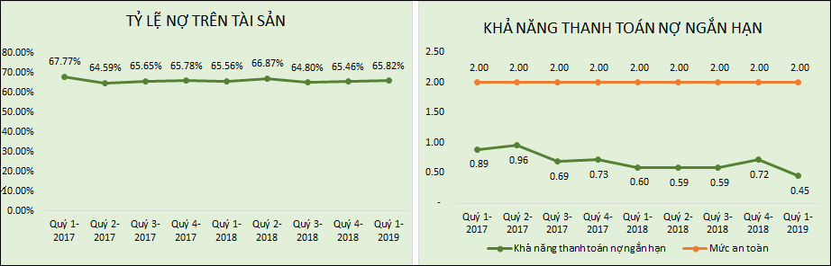 Nhìn qua 9 quý có thể thấy công ty đã duy trì một tỷ lệ nợ khá cao, trung bình khoảng 65,81% và tổng nợ luôn cao hơn vốn chủ sở hữu. Bên cạnh đó HAG cũng vi phạm một số điều khoản của khoản vay và trái phiếu làm cho khả năng hoạt động liên tục của Tập đoàn bị nghi ngờ đáng kể. Khả năng thanh toán ngắn hạn của công ty luôn ở mức dưới 1 lần và ngày càng giảm dần, đến quý 1/2019, khả năng thanh toán ngắn hạn chỉ đạt 0.45 lần. Đây chính là dấu hiệu cho thấy công ty đang mất dần khả năng tự chủ kinh kế và căn bệnh tài chính dùng nguốn vốn ngắn hạn đầu tư dài hạn của doanh nghiệp ngày càng nghiêm trọng. Nhìn vào bảng cân đối kế toán của doanh nghiệp cũng dễ dàng thấy được điều này.