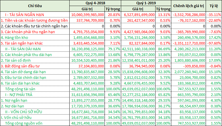 Trong quý 1-2019, tài sản ngắn hạn của công ty giảm hơn 3.500 tỷ đồng, trong đó đáng kể là tài sản ngắn hạn khác giảm 3.351 tỷ đồng, tương ứng mức giảm 97%. Ngược lại, tài sản dài hạn lại tăng thêm hơn 4.200 tỷ đồng chủ yếu là do tăng tài sản cố định 1.803 tỷ và tăng tài sản dở dang dài hạn 2.077 tỷ đồng. Nợ phải trả cũng tăng thêm 663 tỷ đồng, trong đó có đến 597 tỷ đồng là nợ ngắn hạn. Như vậy, ở quý 1-2019, để mua sắm tài sản cố định và đầu tư vào các tài sản dở dang dài hạn, công ty đã phải bán tài sản ngắn hạn và vay thêm nợ ngắn.