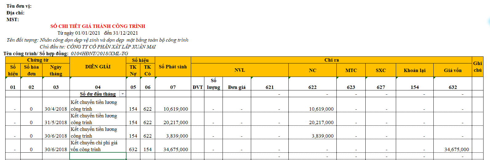 Sổ chi tiết giá thành theo hạng mục