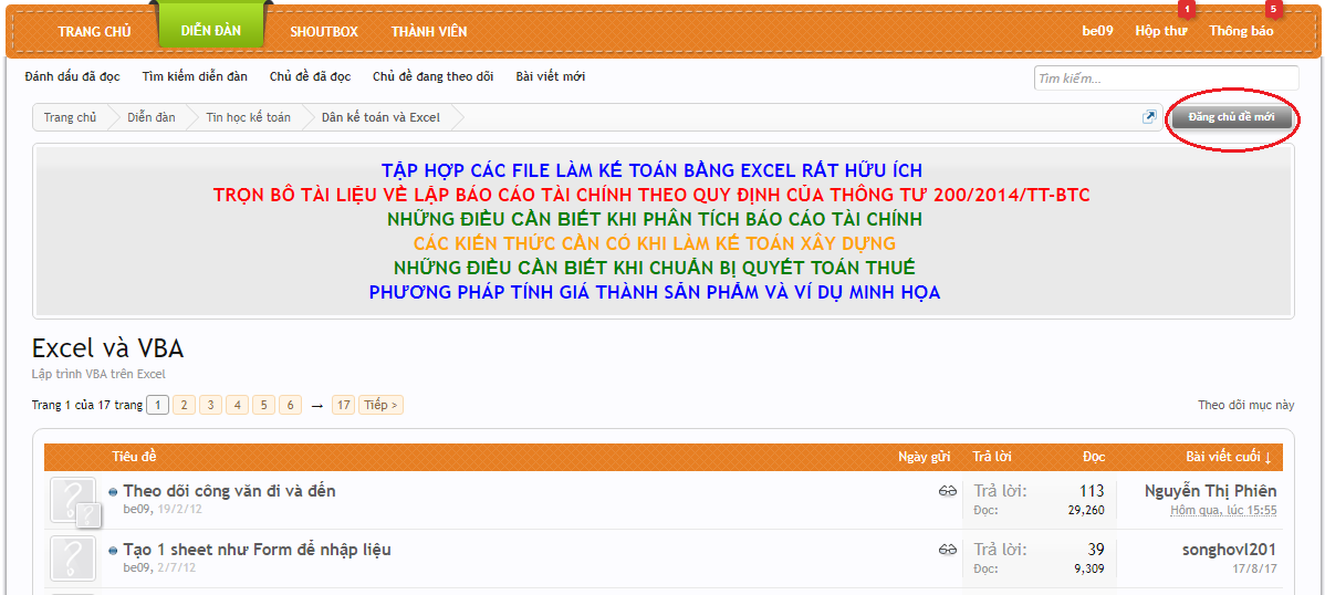 - Khi đăng nhập xong click vào chữ Diễn đàn, tìm đến Box: Dân kế toán và Excel vào Excel và VBA thì mới thấy được chỗ Đăng chủ đềmới (làm theo trình tự của hình).