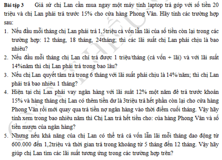 BT : Chị A mua laptop trả góp giá 20 triệu đồng. Chị đã trả được 15% tức 3 triệu đồng. Hiện tại mỗi tháng khả năng chi trả của chị A cho khoản vay trả góp này dao động từ 600,000 đến 1,200,000. Và thời gian trả trong khoảng 5 đến 12 tháng. Yêu cầu tính lãi suất ạ.