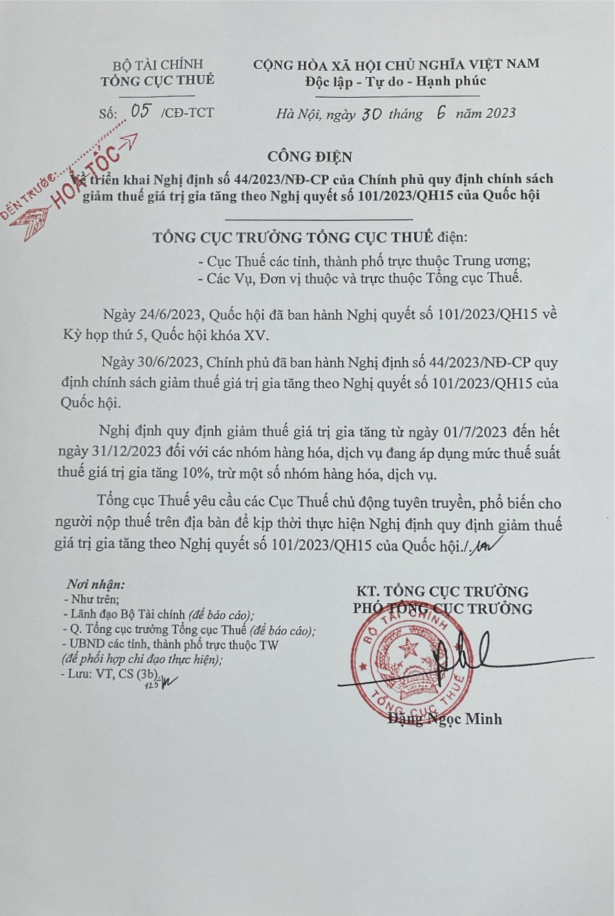 Ngày 30/6/2023, Chính phủ đã ban hành Nghị định số 44/2023/NĐ-CP quy định chính sách giảm thuế giá trị gia tăng theo Nghị quyết số 101/2023/QH15 ngày 24 tháng 6 năm 2023 của Quốc hội.