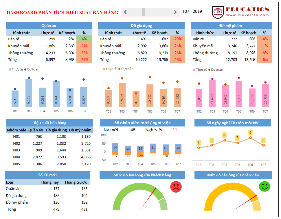 File excel được xây dựng dựa trên dữ liệu bán hàng từ doanh nghiệp bán lẻ với 3 nhóm sản phẩm chính, được bán ra với các loại hình thức bán khác nhau. File được thiết kế tự động, linh hoạt, sử dụng thanh Scroll bar để xem dữ liệu cuốn chiếu theo tháng, dễ dàng so sánh kết quả thực tế so với kế hoạch đề ra, mức chênh lệch cần lưu ý. Chỉ bằng các hàm excel đơn giản như Vlookup, sumifs, hàm offset,... mọi người đã có thể theo dõi hiệu suất bán hàng trên từng tổ, nhóm quản lý, tình hình thay đổi nhân sự trong kỳ, số khách hàng mới tăng thêm của từng mặt hàng. Với biểu đồ " Cây kim " , DN đã có thể theo dõi mức độ hài lòng của khách hàng để đưa ra các chiến lược thúc đẩy kinh doanh phù hợp, đưa ra các chính sách đãi ngộ tốt để nâng cao mức độ hài lòng của nhân viên là cơ sở để tạo ra năng lượng mạnh mẽ thúc đẩy tăng trưởng DN.