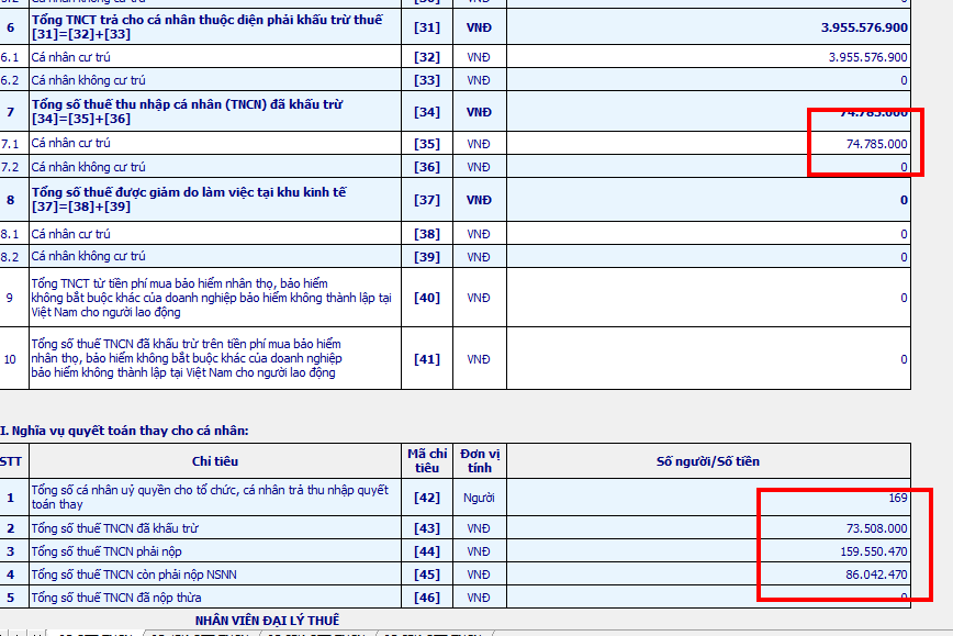 Tuy nhiên trong năm có 2 người nghỉ làm (trong số 13 người này ), cho nên khi lên tờ khai QT em ko tích ủy quyền QT cho 2 người này, cho nên tại phần II- Nghĩa vụ quyết toán thay cá nhân: tờ khai ghi nhận số thuế em đã khấu trừ chỉ có 73.508.000 (NN do ko tích ô ủy quyền cho 2 người nghỉ ).