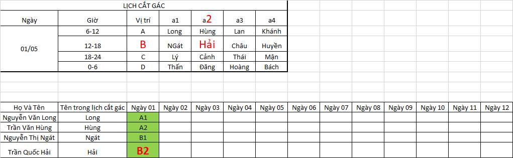 bảng dữ liệu của bạn trông dở hơi vậy, xem lại xem nào. trên ô xanh thì ko xuất vị trí gác theo giờ à, mà chỉ có theo ngày.( Như cái ô ngày 1 thi sẽ xuất vị trí gác theo ca nào 1,2,3,4.?? còn tại cái bảng lịch cắt ( a,b,c,d là mã hoá ca, hay là gì???)