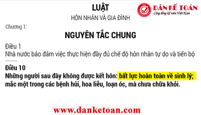 Cụ thể, Luật này quy định trong trường hợp bất lực hoàn toàn về sinh lý thì không được kết hôn tại Điều 10: