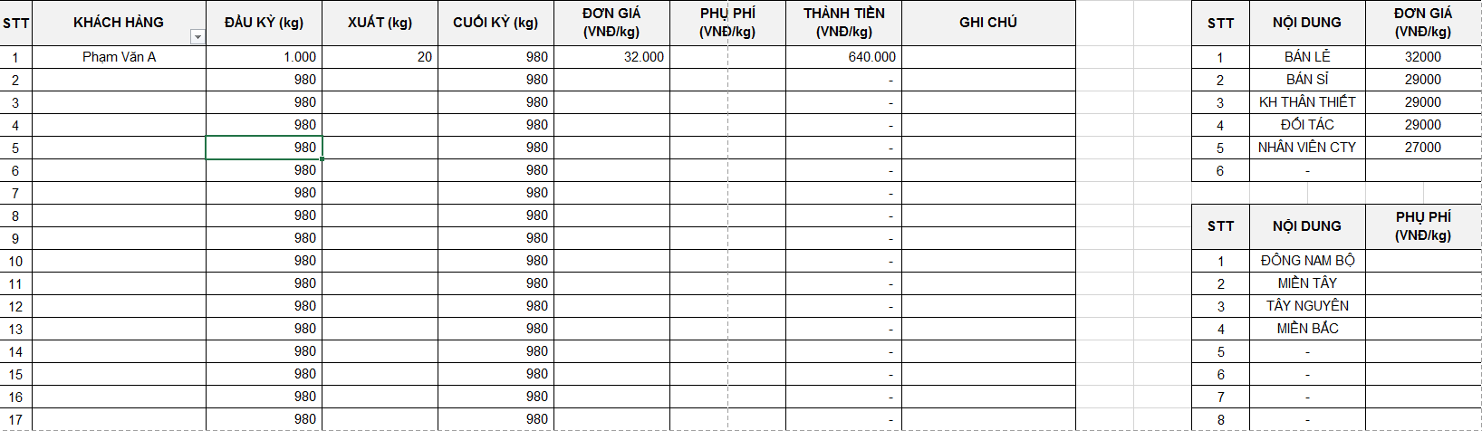 Vấn đề là, mình muốn trong bảng chính, tại cột ĐƠN GIÁ và PHỤ PHÍ có nút bấm xổ xuống lựa chọn nội dung trong 2 bảng phụ, excel sẽ hiển thị giá tương ứng.