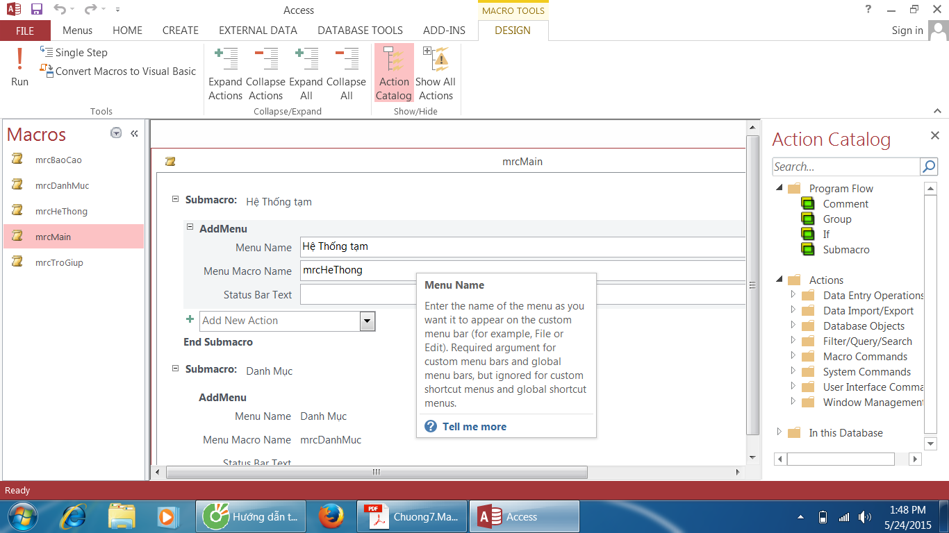 4/ Trong phần Macro của Databasa, các bạn lần lượt mở từng macro một để nghiên cứu, trong đó mrcMain là macro chính để tạo MeNu, các macro còn lại là phục vụ cho mrcMain