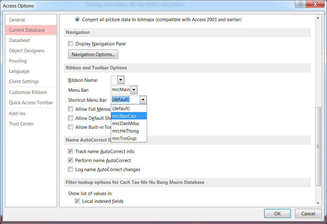 3/ Mở file (Nhớ nhấn phím Shift khi mở, nếu không sẽ không thấy cái Database đâu, chỉ thấy mỗi thanh MeNu thôi)