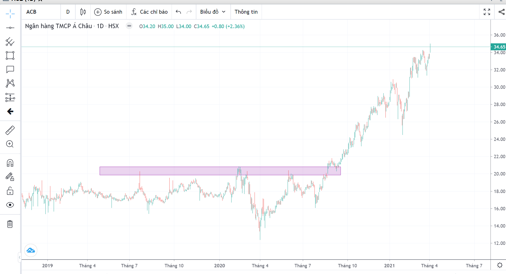 Bạn xem ví dụ mã ACB bên trên sẽ thấy giá rất nhiều lần chạm vùng kháng cự rồi bật xuống nhưng vẫn có những lần phá kháng cự.
