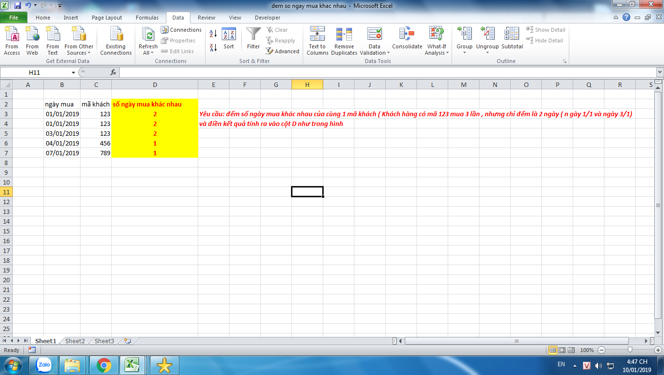 Yêu cầu mình đã ghi rõ trong file.Cụ thể là đếm số ngày mua khác nhau của cùng 1 khách hàng, nếu khách đó trong 1 ngày mua nhiều lần cũng chỉ tính là 1 ngày mua thôi.TKS mnView attachment 962683983