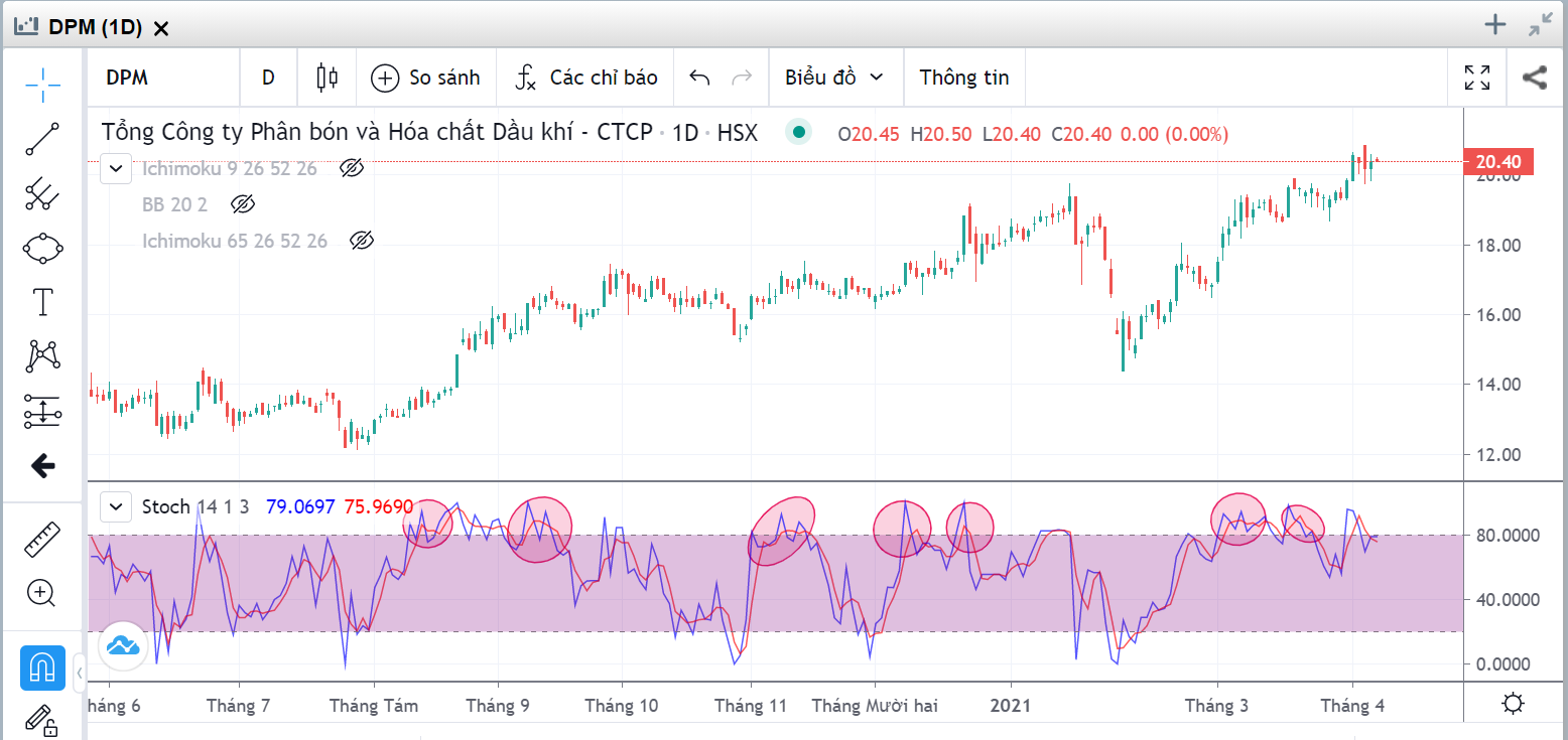- Stochastic trên 80: Quá mua (Overbought)