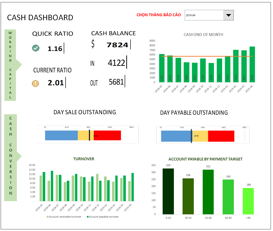 File Cash Dashboard này sử dụng các chỉ tiêu cơ bản để quản lý dòng tiền như :