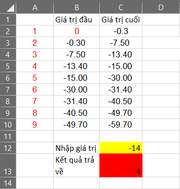 Bây giờ ở Ô C12 nhập vào 1 giá trị bất kỳ kết quả sẽ trả về tương ứng với các số thứ tự.