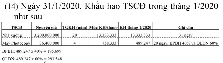 Câu 14 em định khoản là: Nợ TK 627: 13.333.333 Có TK 214: 13.333.333 Nợ TK 641: 195.699 Nợ TK 642: 293.548 Có TK 214: 489.247 Em định khoản như vậy có đúng không ạ? Em cảm ơn