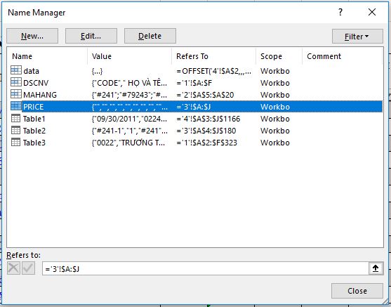 2/ Dựa vào cột C (MÃ HÀNG) của Sheet 3, tại Sheet 4 dùng hàm VLOOKUP để tra dữ liệu (vùng đỏ), trong hàm có chữ PRICE nó là Name, muốn biết Name có tên PRICE được chọn vùng từ đâu đến đâu thì nhấn tổ hợp phím Ctrl + F3 (xem hình).