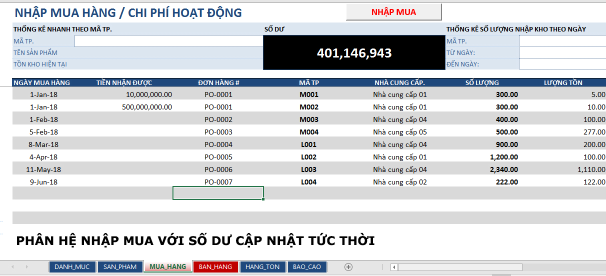 - Khai báo nhập kho/ Chi phí/ Tiên thu được - nhận được trong kỳ tại sheet: MUA_HANG. Các bạn chú ý là sau khi nhập lượng mua - Lượng tồn lũy kế sẽ xuất hiện (lượng tồn = lượng đầu kỳ - đơn hàng bán trong kỳ + lượng nhập) giúp người vô đơn hàng mua dễ kiểm soát