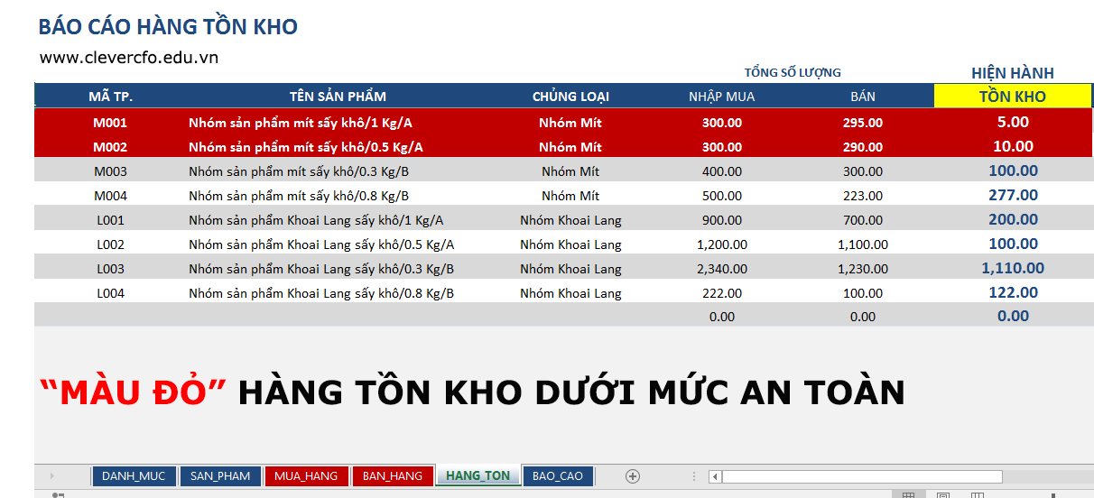 - Báo cáo hàng tồn: sheet HANG_TON - Màu đỏ là lượng hàng tồn dưới mức an toàn