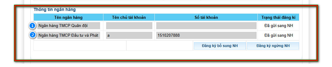 -Trong trang thuedientu có 2 số tài khoản sau bị điền sai. Em đã bấm vào phần “Đăng ký ngừng NH” nhưng không ngừng được (không hiện tài khoản ngân hàng để ngừng)